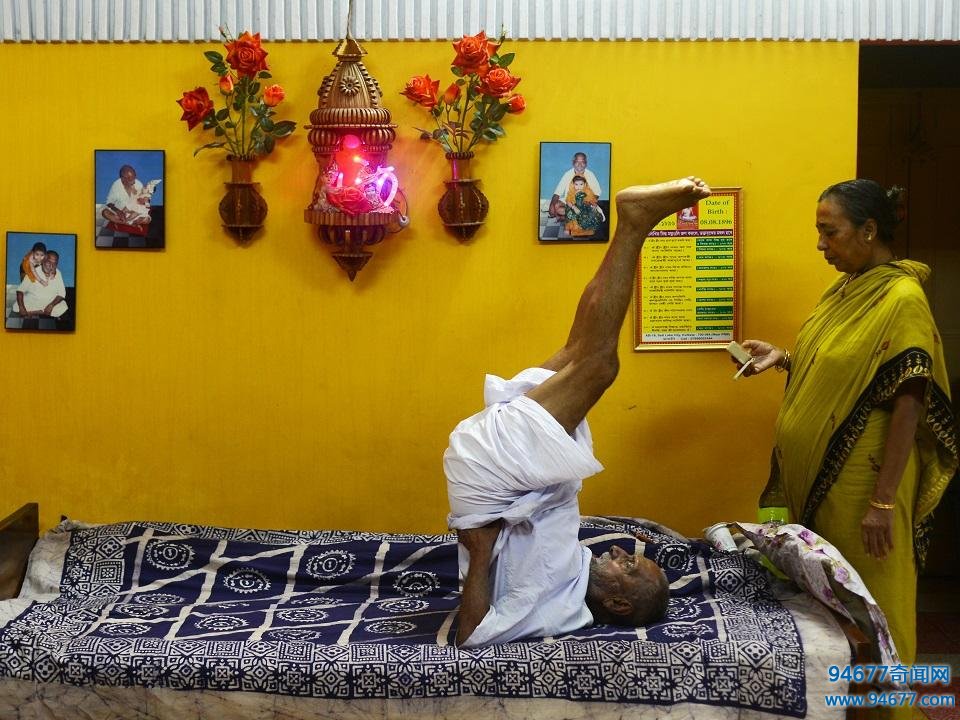 谈起自己的长寿秘诀,老人说自己喜欢做瑜伽,还归功于他合理的饮食——他不沾酒精,不吃鱼肉。 图为老人正锻炼身体。