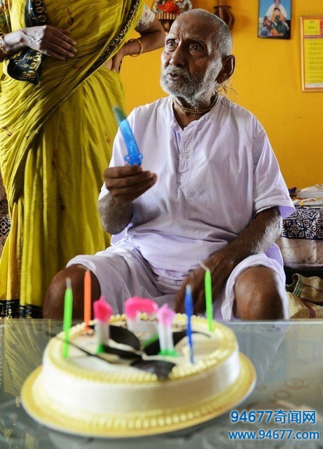 图为老人120岁时的生日。他说:“我吃得很简单,只有煮熟的食物,没有油或香料,米饭和煮熟的石炖肉(扁豆炖)与几个绿色辣椒。我甚至不吃牛奶或水果。