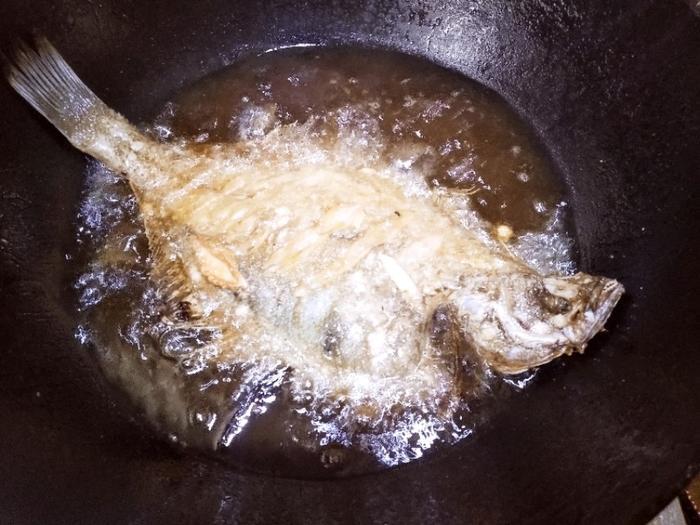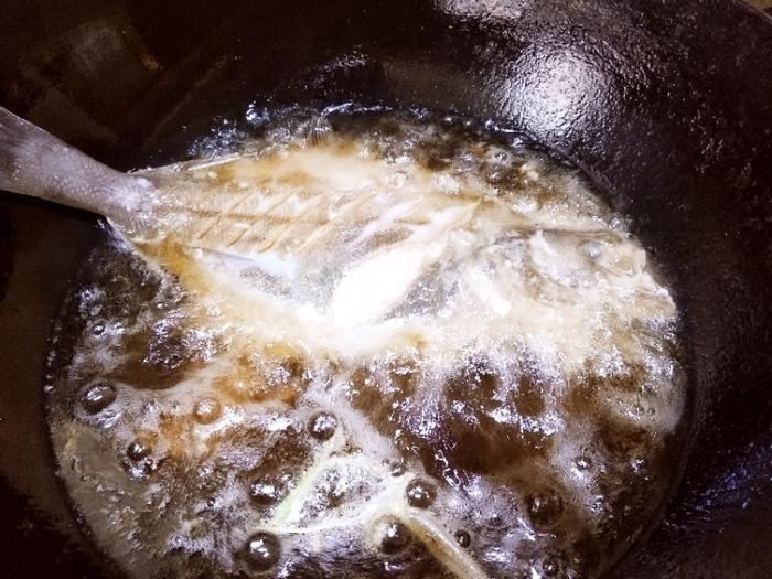炸鱼要想酥脆一定要炸两遍,也就是第一遍把鱼炸熟、炸定型,然后捞出待油温升高到八、九成热时,再把鱼入锅复炸一遍。