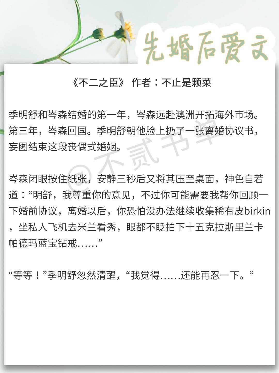 一说到先婚后爱,《不二之臣》这本小说肯定跑不脱,没有看过的,一定要去看,太可了!