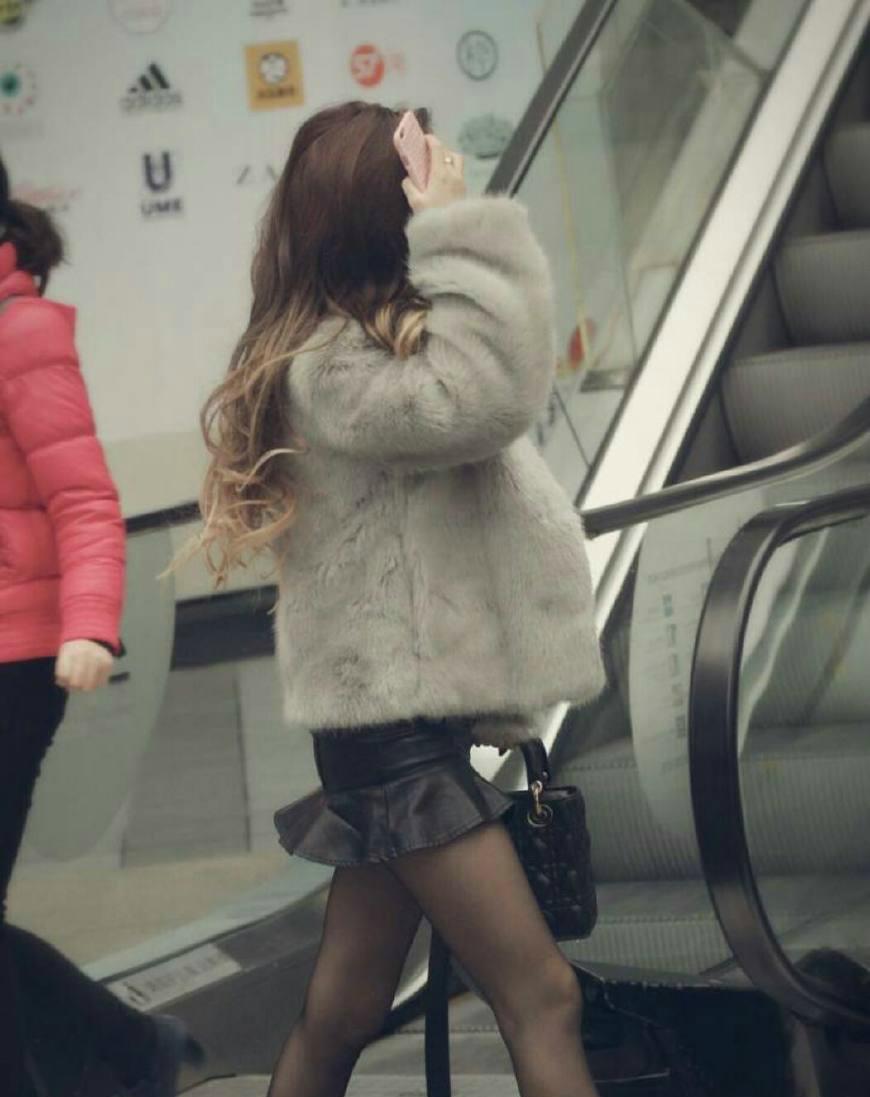 毛绒的短款大衣搭配上黑色的包臀皮裙,然而黑色的丝袜更是很好的勾勒出下半身的性感,妩媚却又不失内敛