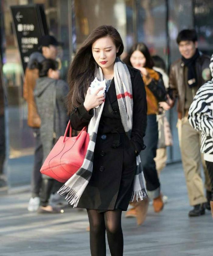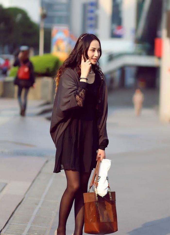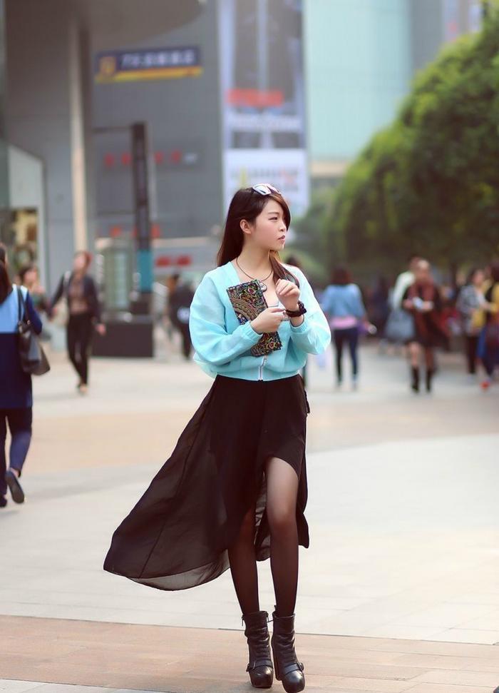 黑色丝袜是女性的成熟标志,黑色的裙子飘逸在街道上,显得格外独特迷人,当然蓝色的外套让她成为人群中最亮眼的存在