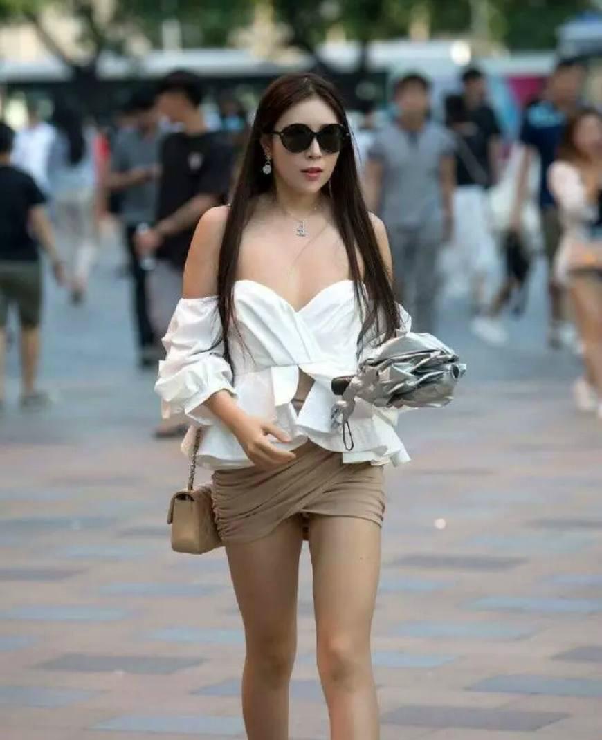 白色的下落式抹胸裙搭配上条纹褶皱短裙,这突显了前卫潮流的穿搭,也将身材优势展现出来,给人满满的性感