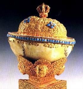 嘎巴拉碗是藏传佛教里一件法器,是僧人在举行灌顶仪式时所用,与其配套的还有一个圣壶,这个嘎巴拉碗正是接受灌顶仪式的僧人喝圣酒时所用的,也可以说是个酒杯。杨琏真迦正是藏传佛教僧人,他知晓嘎巴拉碗用越尊贵人的头颅制作越好。