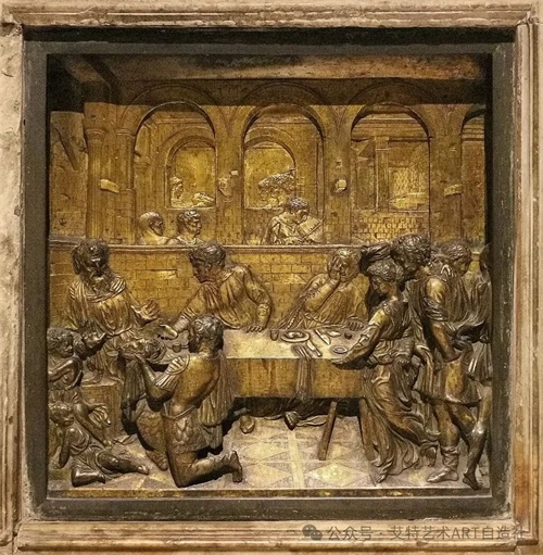 多纳泰罗的许多最伟大的杰作都是用青铜完成的。他早期独立的作品之一是他第一个青铜浮雕,希律的盛宴 (1427),这是为锡耶纳大教堂的圣乔瓦尼洗礼堂创作的。浮雕描绘了希罗德被圣约翰的首级所震惊的戏剧性时刻。浮雕中的人物表现出强烈的情感反应,有助于增强戏剧场景的紧张感。通过在作品中添加建筑元素,多纳泰罗展示了他对线性透视的了解和掌握。