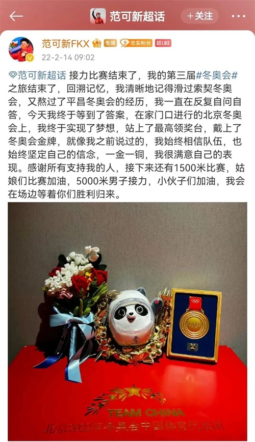今天早上,范可新在微博发文告别北京冬奥会,全文如下: