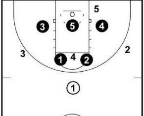 这是“二三联防”最经典的站位:上线二人站在罚球线两顶端至三分线内,下线有两人站在底角三分线以内一到两步,篮下站一人保护篮板,形成了最原始的二三站位。由图可以看出,二三联防属于站位联防,基本盯球而非防人。