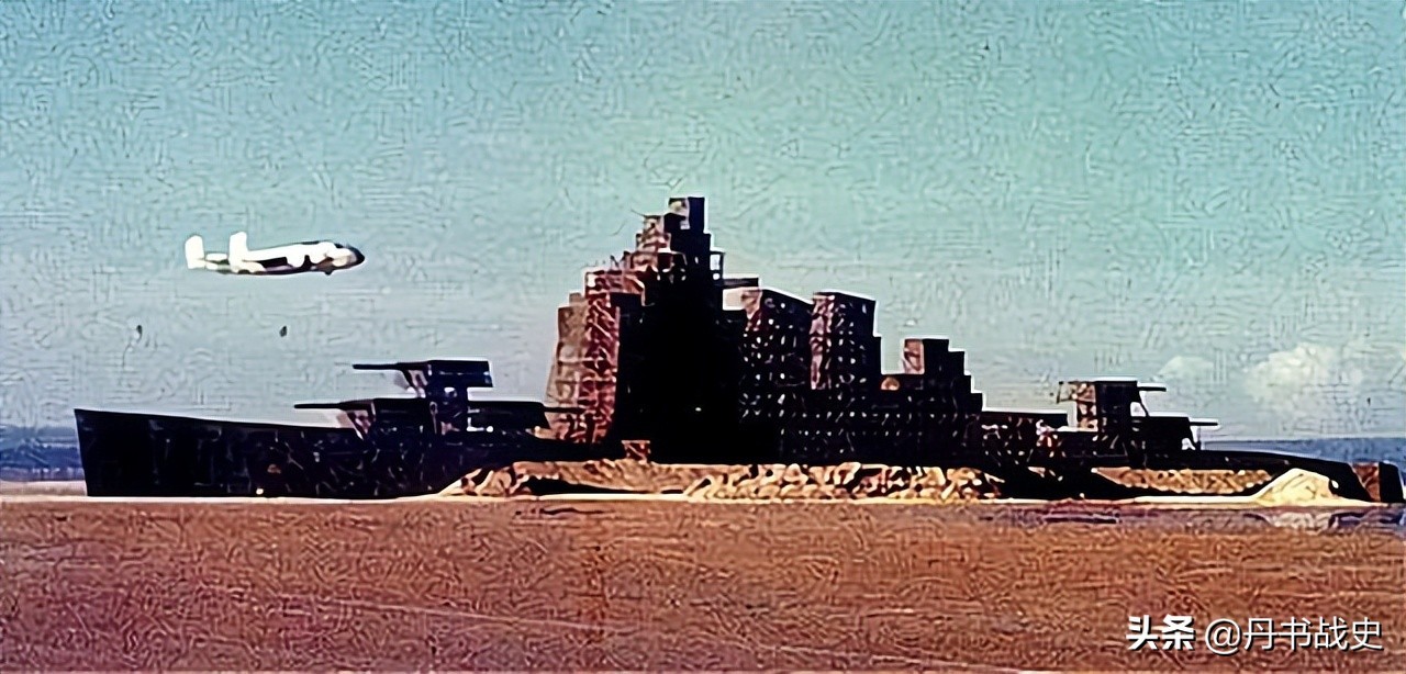战舰的造价约为35820美元,正式名称其实叫“T-799日本战列舰”,它采用木材和铁丝网搭建框架,外表覆盖普通建筑用的防水焦油纸。从外形来看它基本模仿了高雄级的大致外形,例如前后5座主炮塔、高耸的舰桥、烟囱等,顶部还插上日军军旗,从空中远远望去还真是那么回事。