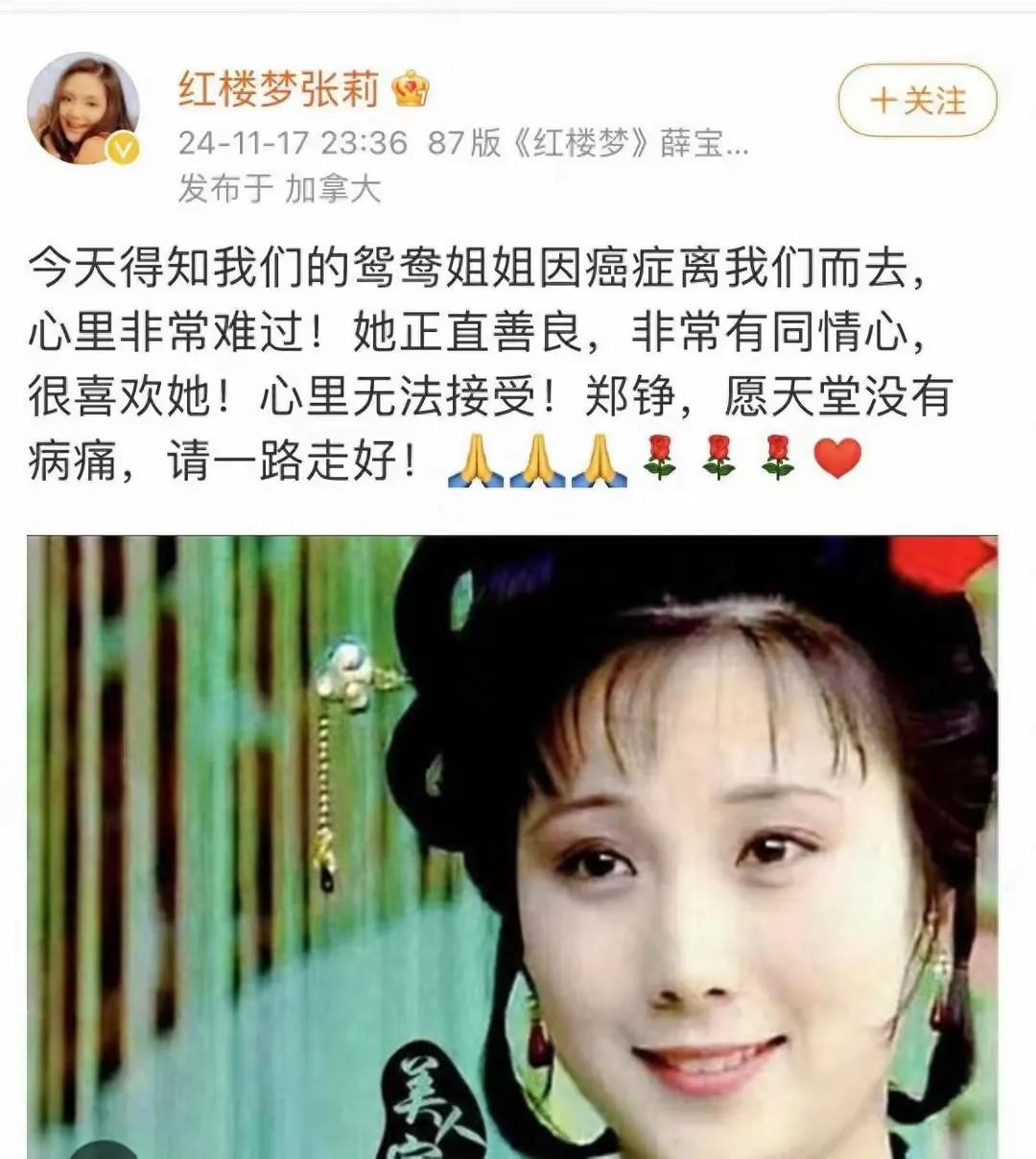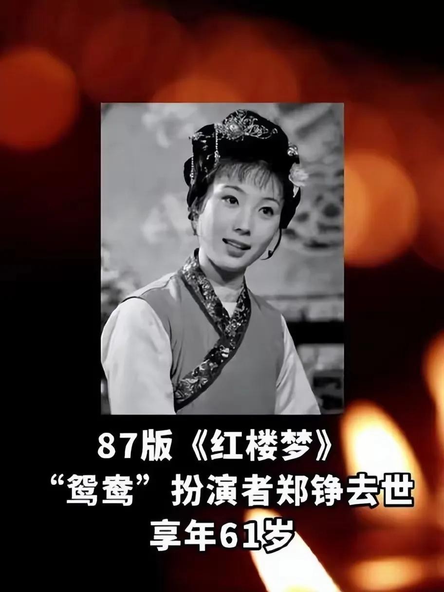 "金鸳鸯哪去了?"这句话,如今再问,只剩下无尽的悲凉。11月20日,曾出演87版《红楼梦》金鸳鸯一角的演员郑铮,因病医治无效在美国去世,享年61岁。