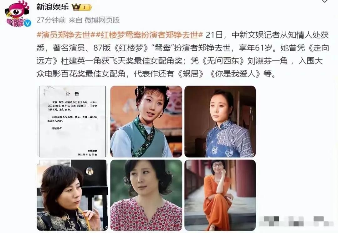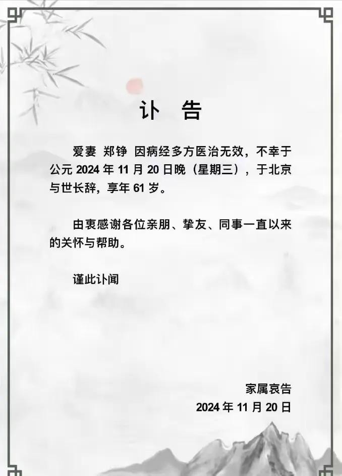 61岁知名演员郑铮离世,丈夫悲痛发讣告,最后露面照曝光引人惋惜