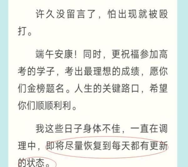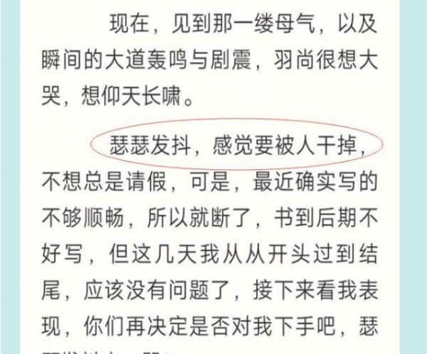 这个是在辰东写到《圣墟》的楚风进入到太上的山脉的时候写到的。自己如同挨了一刀,至于挨了谁的刀,辰东没有说,这个理由太搞笑了吧。但是后面说到明天开始奋起上路,很明显辰东的意思就是说开始恢复更新了。但是这样的节奏代表了什么别人或许不知道,但是看过《圣墟》的读者都是知道的。也正是说完这句话,七天两更新的节奏,变成了7天一更。