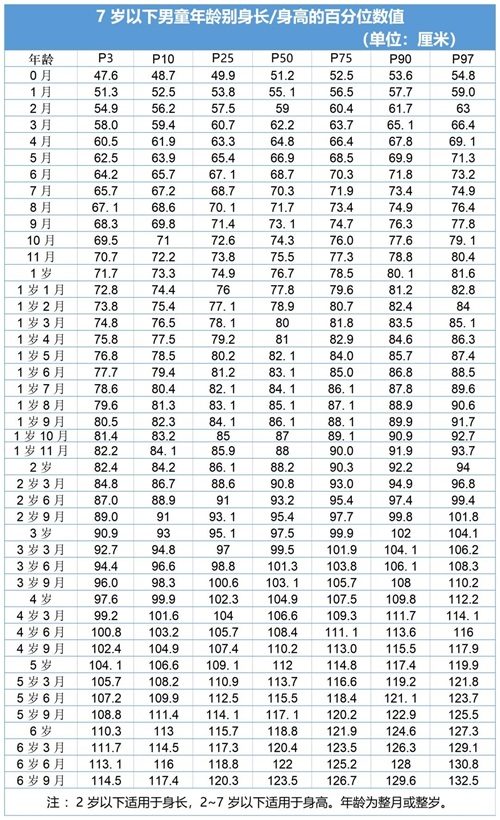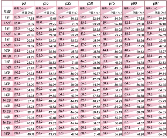 上述表格中,孩子身高在P3~P97之间都视为正常范围,P50为中位值,P25~P75为中等水平,大多数该年龄阶段的孩子均处于这个水平段。如果发现孩子的身高≥P97或者<P3,则提示身高增长过快或者过慢。