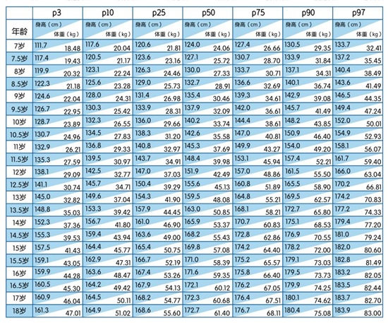 7-18岁儿童及青少年身高、体重百分位数值(男)