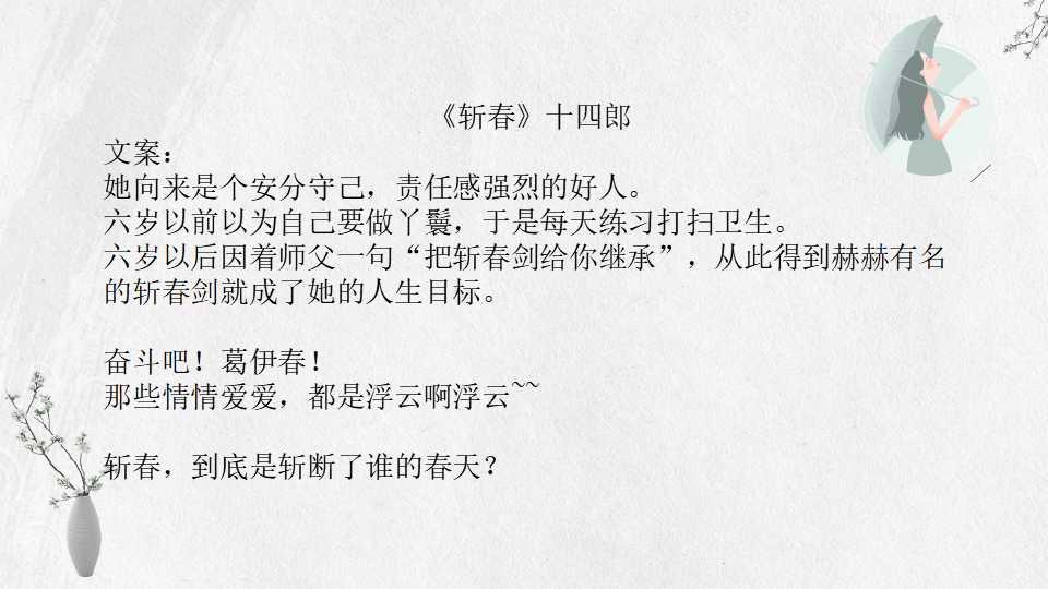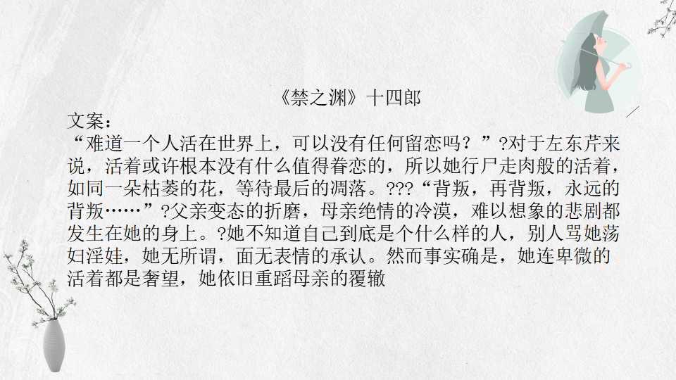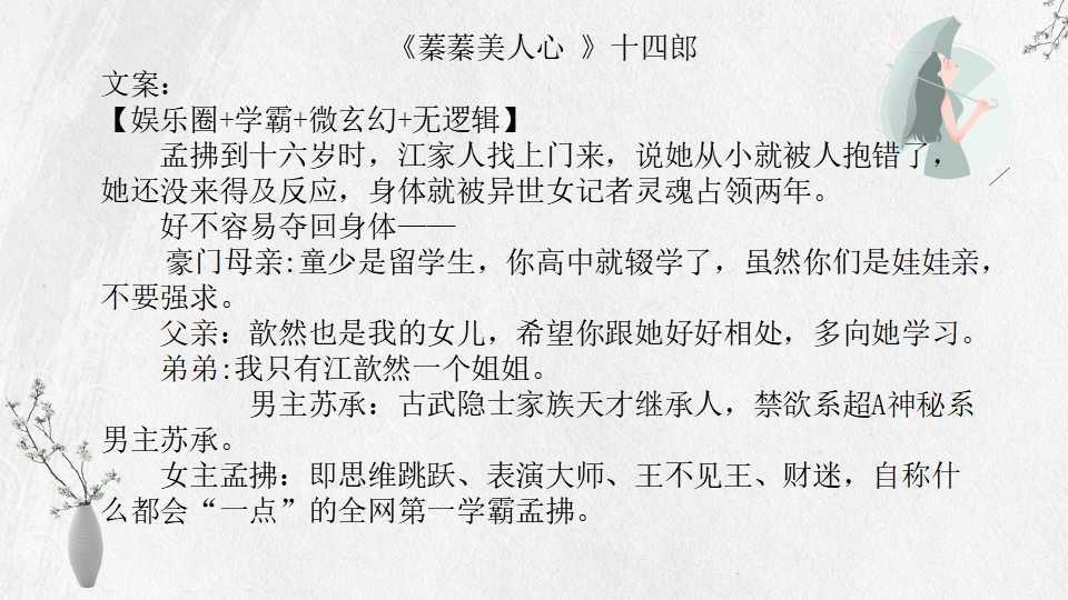 十四郎,觉得十四郎的名字听起来像男生,披着十四十四的号写了琉璃和跑江湖两篇文。她的小说多以古言仙侠为主,剧情流畅,文笔清新,人物饱满。早期还有个马甲号“半袖红雪”,这个马甲下的文大家自己搜吧。她的小说,除了寥寥无几的两篇现代文,其余作品都是古言仙侠,喜欢此类文的小伙伴不要错过。