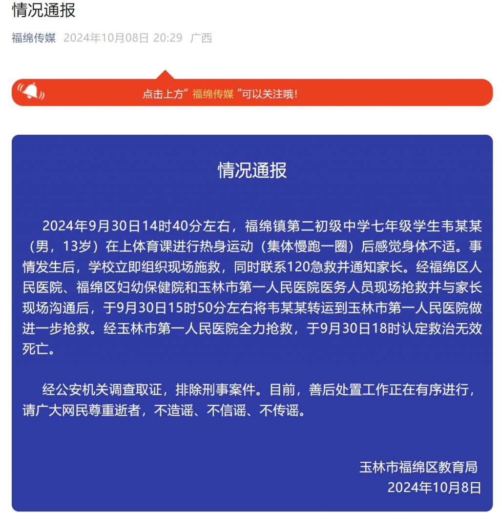 2024 年 9 月 30 日 14 时 40 分左右,福绵镇第二初级中学七年级学生韦某某(男,13 岁)在上体育课进行热身运动(集体慢跑一圈)后感觉身体不适。事情发生后,学校立即组织现场施救,同时联系 120 急救并通知家长。经福绵区人民医院、福绵区妇幼保健院和玉林市第一人民医院医务人员现场抢救并与家长现场沟通后,于 9 月 30 日 15 时 50 分左右将韦某某转运到玉林市第一人民医院做进一步抢救。经玉林市第一人民医院全力抢救,于 9 月 30 日 18 时认定救治无效死亡。