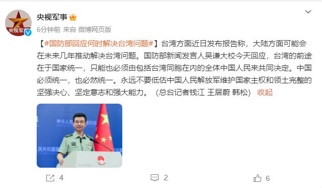台湾方面近日发布报告称,大陆方面可能会在未来几年推动解决台湾问题。国防部新闻发言人吴谦大校今天回应,台湾的前途在于国家统一,只能也必须由包括台湾同胞在内的全体中国人民来共同决定。中国必须统一,也必然统一。永远不要低估中国人民解放军维护国家主权和领土完整的坚强决心、坚定意志和强大能力。(总台记者钱江 王居蔚 韩松)
