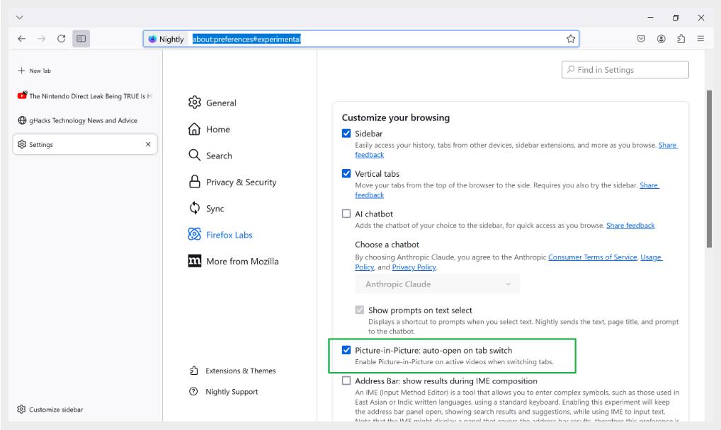 IT 之家小伙伴可以在火狐浏览器设置中的 Firefox Labs 找到这个选项,或者在地址栏输入 "about:preferences#experimental" 并回车。该功能开关后无需重启浏览器。