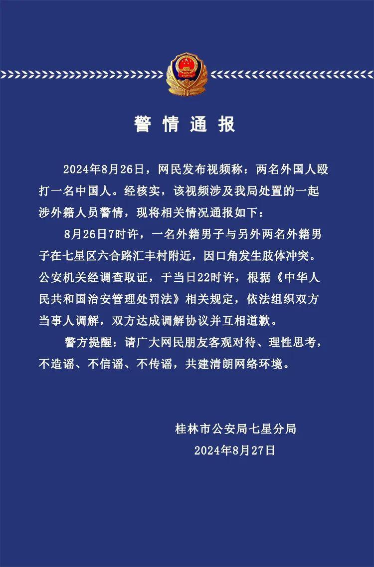 近日,网传两名外国人在广西一警务室门口将中国人殴打在地。8 月 27 日晚,广西桂林市公安局七星分局发布警情通报,全文如下: