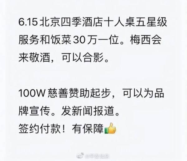 近日,这样一段文字在网上流传开来,"6.15,北京四季酒店,十人桌五星级服务和饭菜,30 万一位。梅西会来敬酒,可以合影。100W 慈善赞助起步,可以为品牌宣传。发新闻报道。签约付款!有保障 "。