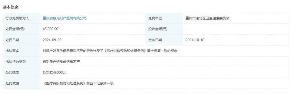 据企查查信息显示,重庆安琪儿妇产医院 " 对孕产妇身份信息查对不严 ",其行为违反了《医疗纠纷预防和处理条例》相关规定被处罚款。