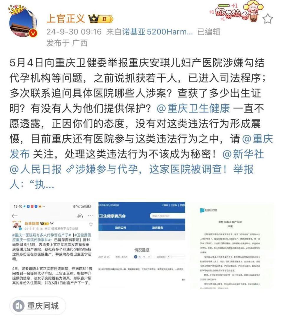 据此前报道,今年 5 月初,打拐志愿者上官正义向重庆卫健委举报,重庆安琪儿妇产医院涉嫌勾结代孕机构等问题,重庆市卫健委回电称该案已进入司法程序。