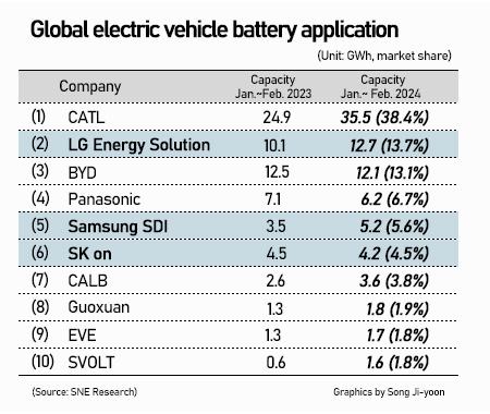 报告显示,韩国三大电池制造商今年前两个月在全球电动汽车 ( EV ) 电池市场的总市场份额同比下降了 1.2 个百分点。