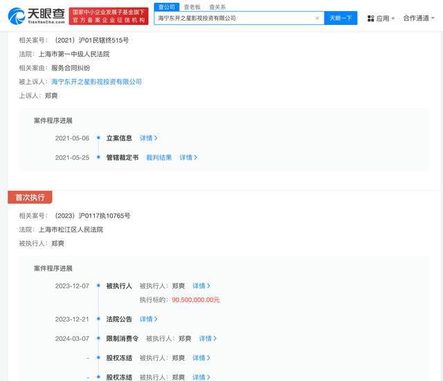 据天眼查法律诉讼信息显示,近日,郑爽与海宁东开之星影视投资有限公司合同纠纷案件新增执行裁定书。