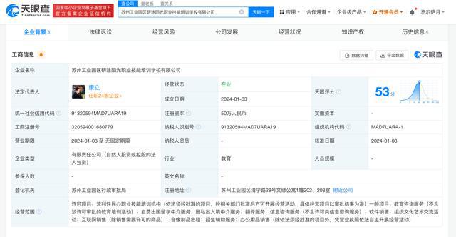 天眼查 App 显示,近日,苏州工业园区研途阳光职业技能培训学校有限公司成立,法定代表人为康立,注册资本 50 万人民币,经营范围含营利性民办职业技能培训机构、教育咨询服务、自费出国留学中介服务、招生辅助服务等。股东信息显示,该公司由苏州研途教育科技有限公司全资持股,张子彪(张雪峰)担任后者监事并持股约 10.86%。公开信息显示,张雪峰为苏州研途教育科技有限公司副总裁、联合创始人。