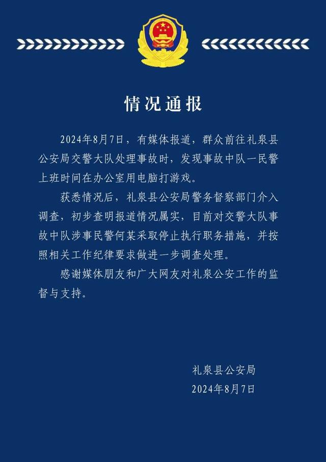 8 月 7 日,有媒体报道,群众前往礼泉县公安局交警大队处理事故时,发现事故中队一民警上班时间在办公室用电脑打游戏。