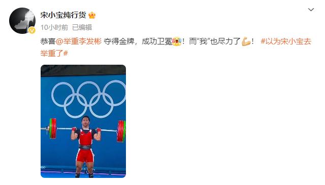 8 月 7 日晚,宋小宝纯发文恭喜李发彬夺冠说:" 恭喜李发彬夺得金牌成功卫冕!而‘我’也尽力了!" 还加上了 " 以为宋小宝去举重了 " 话题回应和举重选手撞脸。