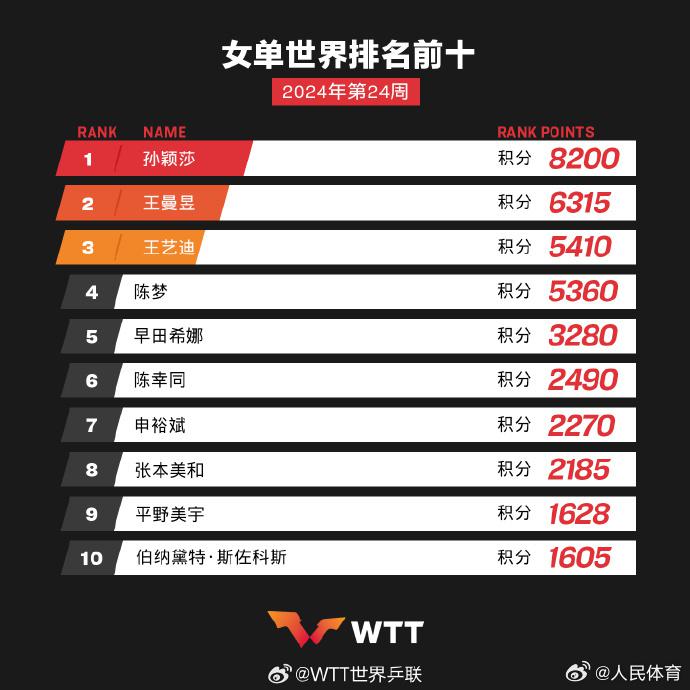 女单:孙颖莎 、王曼昱 、王艺迪、陈梦位居前四、陈幸同第 6