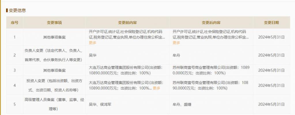【万达商管退出合肥万达广场】国家企业信用信息公示系统网站显示,近日,合肥万达广场商业发展有限公司发生工商变更,原股东大连万达商业管理集团股份有限公司退出,苏州联商壹号商业管理有限公司成唯一股东,同时,公司主要人员亦发生变更。合肥万达广场商业发展有限公司成立于 2009 年 6 月,法定代表人为牟舟,注册资本 10890 万元。 ( 中新经纬 APP )