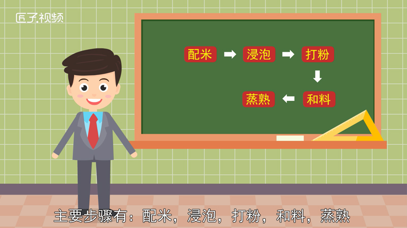 崇明糕由精选糯米和白米按一定比例制成,主要步骤有:配米,浸泡,打粉,和料,蒸熟。