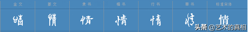 “情”右边的“青”,既是声旁也是形旁,是“倩”的省略,表示漂亮。情,金文(心,意愿)+(青,“倩”,漂亮),表示美意。造字本义:名词,痴心,美意。篆文将金文字形中的写成,将金文字形中青做了一定的变体。隶书将篆文字形中的“心”写成竖心旁 。丽水为“清”*,丽日为“晴”,美言为“请”,美意为“情”。