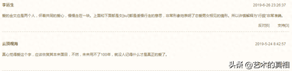 有网友认为,爱的金文应是两个人,怀着共同的爱心,慢慢走在一块。上面和下面都是夊[suī],是缓慢行走的意思,非常形象地表明了恋爱男女相见的情形。