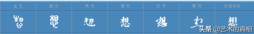 相,既是声旁也是形旁,表示容貌、形象。想,金文(相,容貌、形象)+(心,存念),表示心存其容其貌。造字本义:动词,心存其容其貌,追思、怀念。篆文承续金文字形。隶书将篆文字形中的“心”写成楷书的。自虑为“思”;念他为“想”。