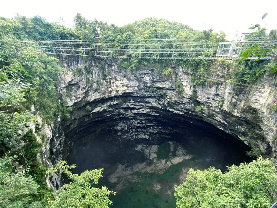 矅天眼是一个神秘的天坑,还建有悬空索道和攀岩设施,另可乘坐电梯或沿着步道下到谷底。