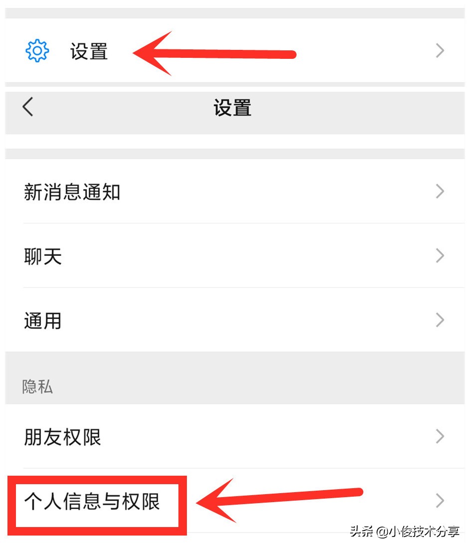 我们打开微信设置,然后往下翻找到【个人信息与权限】并打开