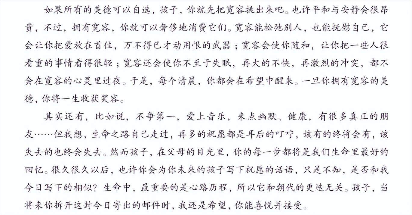 2、白岩松在信中说:“也许你会为你未来的孩子写下祝愿的话语,只是不知,是否和我今日写下的相似? ”不妨你也为学着给自己未来的孩子写一封信。