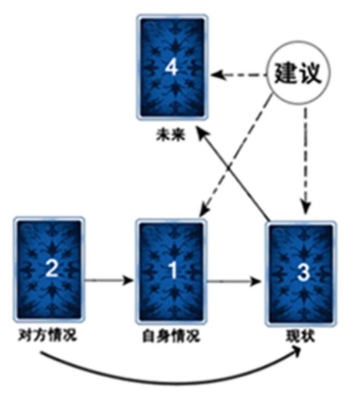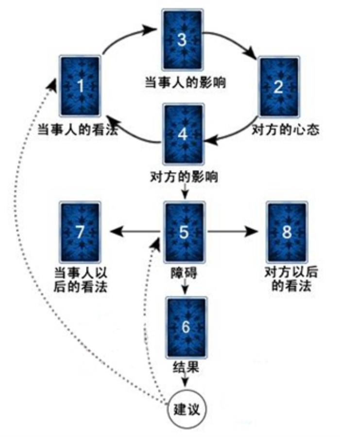 一号牌阵:灵感对应局适合占卜:双方的心态、对这段感情的看法与期待。(未表白、进行中、已分手皆可。) 牌位意义: 1. 你对对方的看法 2. 对方对你的看法 3. 你认为的双方关系 4. 对方认为的双方关系 5. 你对未来的期待 6. 对方对未来的期待二号牌阵:恋人之树展开法 适合占卜:整体的爱情状况。 牌位意义: 1. 你对对方的看法或态度 2. 对方对你的看法或态度 3. 你认为的双方关系 4. 对方认为的双方关系 5. 你必须做的行动、表现的态度或建议。 6. 防范突然产生的变化(由对方反应产生或外界环境改变) 7. 两人最后可能的结果 三号牌阵: