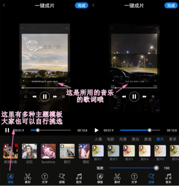如果想制作以图片为主的视频,我们可以选择【音乐相册】。导入多张照片,挑选心仪的模板即可。不得不夸一下,它内置的滤镜可以完美适用于各种场景,提供的音乐也都是热门歌。效果如下,非常抓人眼球
