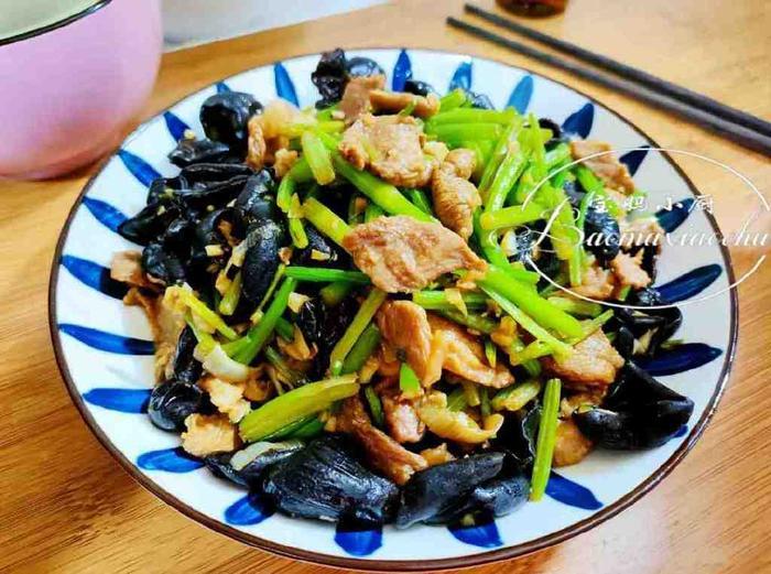需要的食材:嫩芹菜1小把,3肥7瘦猪肉1块,干木耳半把
