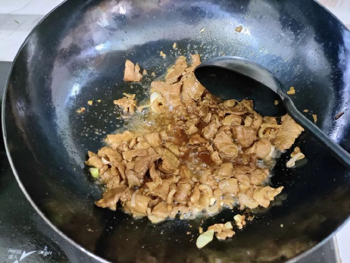 2,锅里加植物油烧热,倒入肉片大火翻炒,炒到肉片变色,锅里的菜汁由浑变清亮