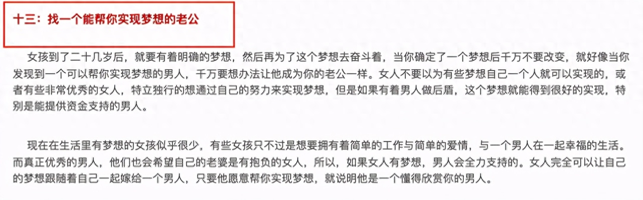 杨澜还写了一篇给二十几岁女孩的忠告,里面有这么一句:“找一个能帮助你实现梦想的老公。”