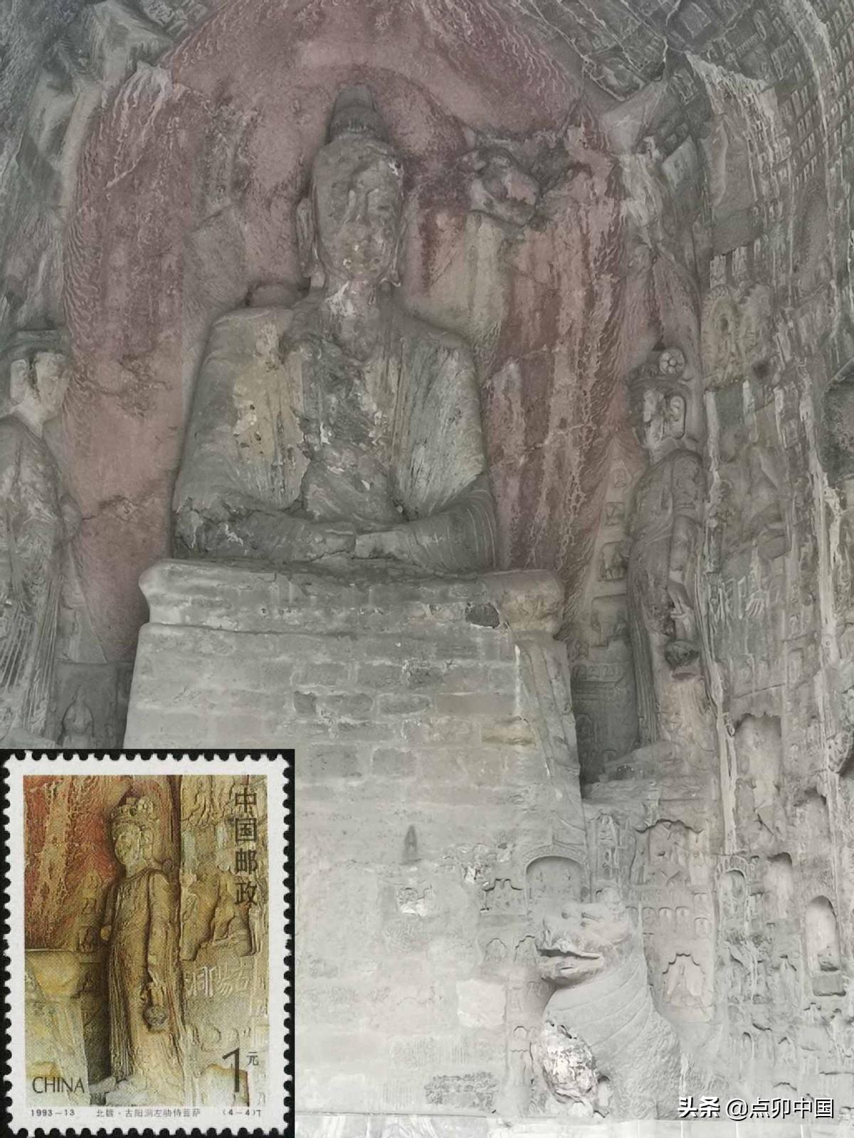 古阳洞是北魏孝文帝为祖母冯太后营建的功德窟,开凿于493年,是龙门石窟造像群中开凿最早的洞窟,号称“龙门第一窟”。洞中北壁刻有楷体“古阳洞”三个字,到了清末光绪年间,道教徒将主像释迦牟尼涂改成太上老君的形象,讹传老子曾在这儿炼丹,所以古阳洞又叫老君洞。古阳洞内碑刻题记近千品,是中国石窟保存造像铭最多的一座石窟,闻名宇内的魏碑作品“龙门二十品”有十九品出于古阳洞。1993年发行的一套《龙门石窟》邮票有一张就是古阳洞左胁侍菩萨。