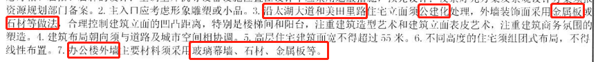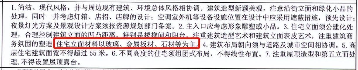 1、住宅立面须公建化处理,住宅立面材料以玻璃、金属板材、石材等为主。相比38号地只对路边的楼栋有高品质立面要求,新地块把要求扩展到整个小区所有楼幢。
