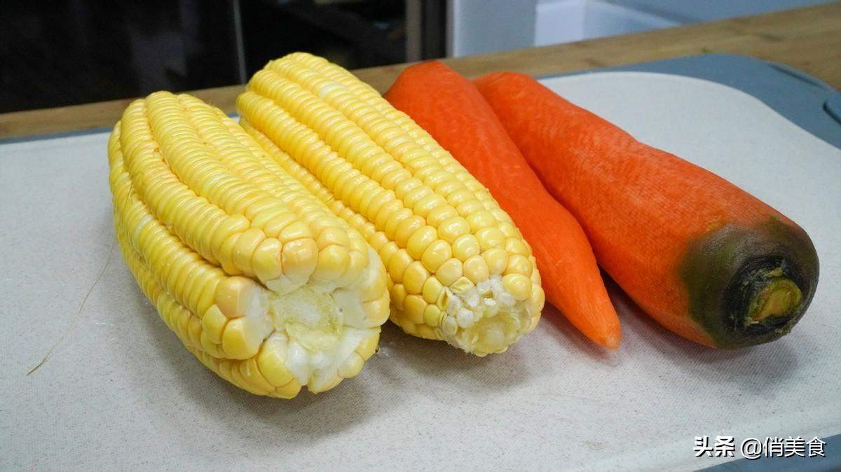 4、准备一些胡萝卜和玉米都切成块,这个也就是孩子喜欢吃的配菜,不需要准备太多,做这道汤主要是喝汤和吃肉。