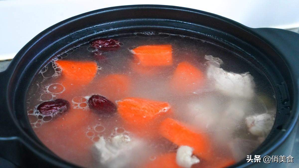 6、汤炖至40分钟的时候就可以把玉米、胡萝卜、红枣倒入砂锅里了。红枣一定要去核,不去核的红枣炖出的汤喝了很容易上火的。有的朋友会在这个时候放盐,先不要着急,盐放得早了炖出的汤不鲜,肉还会发柴口感非常不好,盐一般都是在汤炖好后加入就可以了。