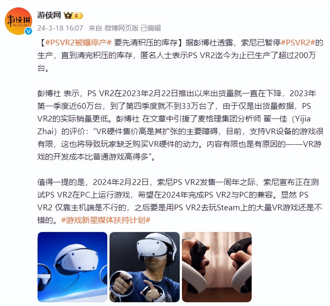 去年3月,据彭博社透露,索尼在当时已暂停PSVR2的生产,直到清完积压的库存,匿名人士表示PSVR2在当时已生产了超过200万台。