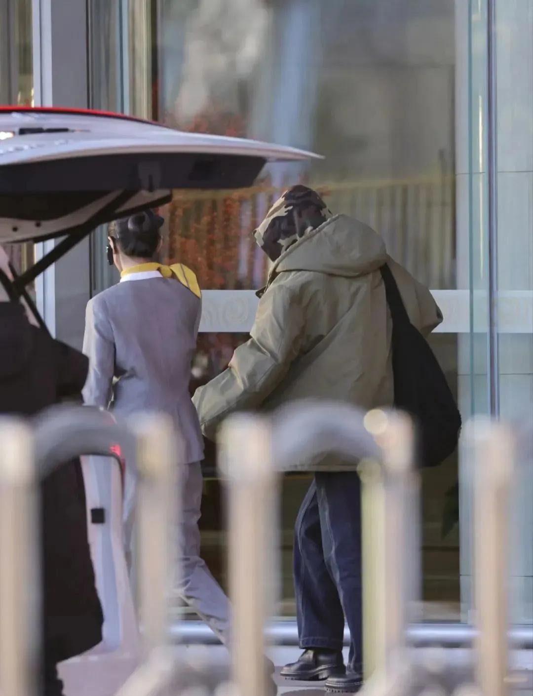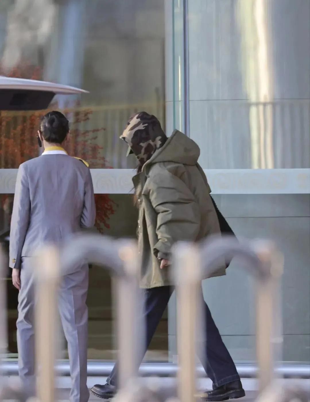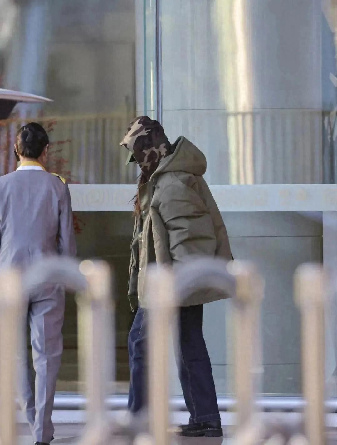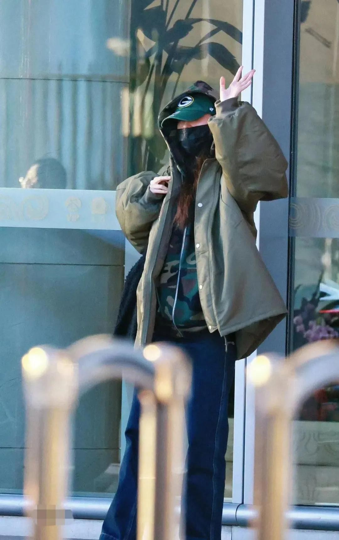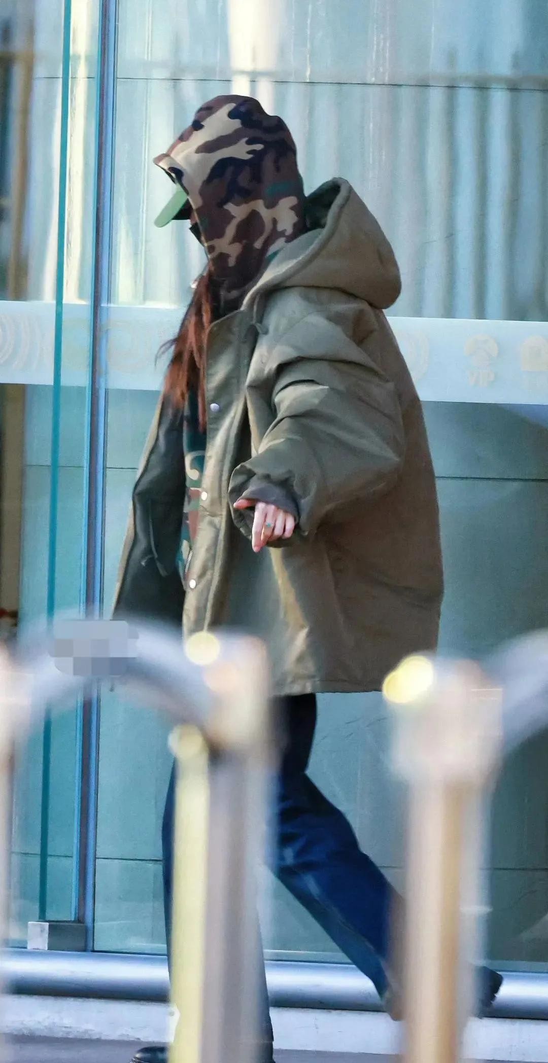 38岁杨幂机场照,迷彩服牛仔裤搭配连帽羽绒服,酷飒又时尚